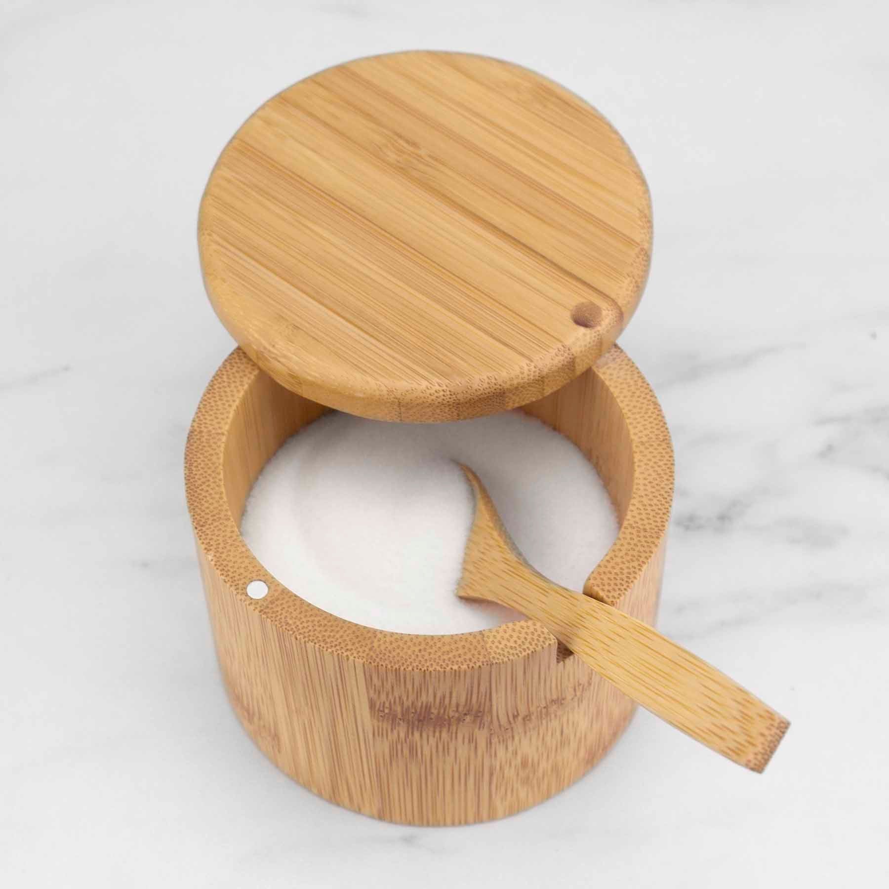 Flavorful cooking is at your fingertips with our Little Dipper Salt Cellar with Salt Spoon! This beautifully crafted bamboo salt cellar is an ideal way to store up to 6 ounces of salt, herbs, spices or seasonings in the kitchen. It features a bamboo serving spoon to dole out just the right amount of salt or spice. The salt cellar is cleverly designed with a notch in the side to store the spoon when not in use. The ingenious magnetic lock and swiveling lid design makes it easy for busy cooks to grab a pinch of seasoning with just one hand. It's great outside the kitchen too: use it to store jewelry, office supplies, knickknacks and more!