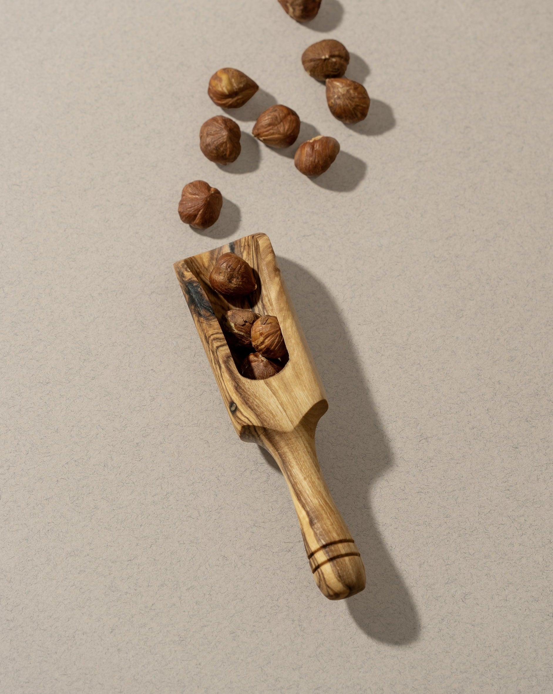 Handcrafted with natural olive wood, this scoop is perfect for any pantry item. Its unique shape allows for easy handling of flour, sugar, and other items. It's the perfect size for serving.